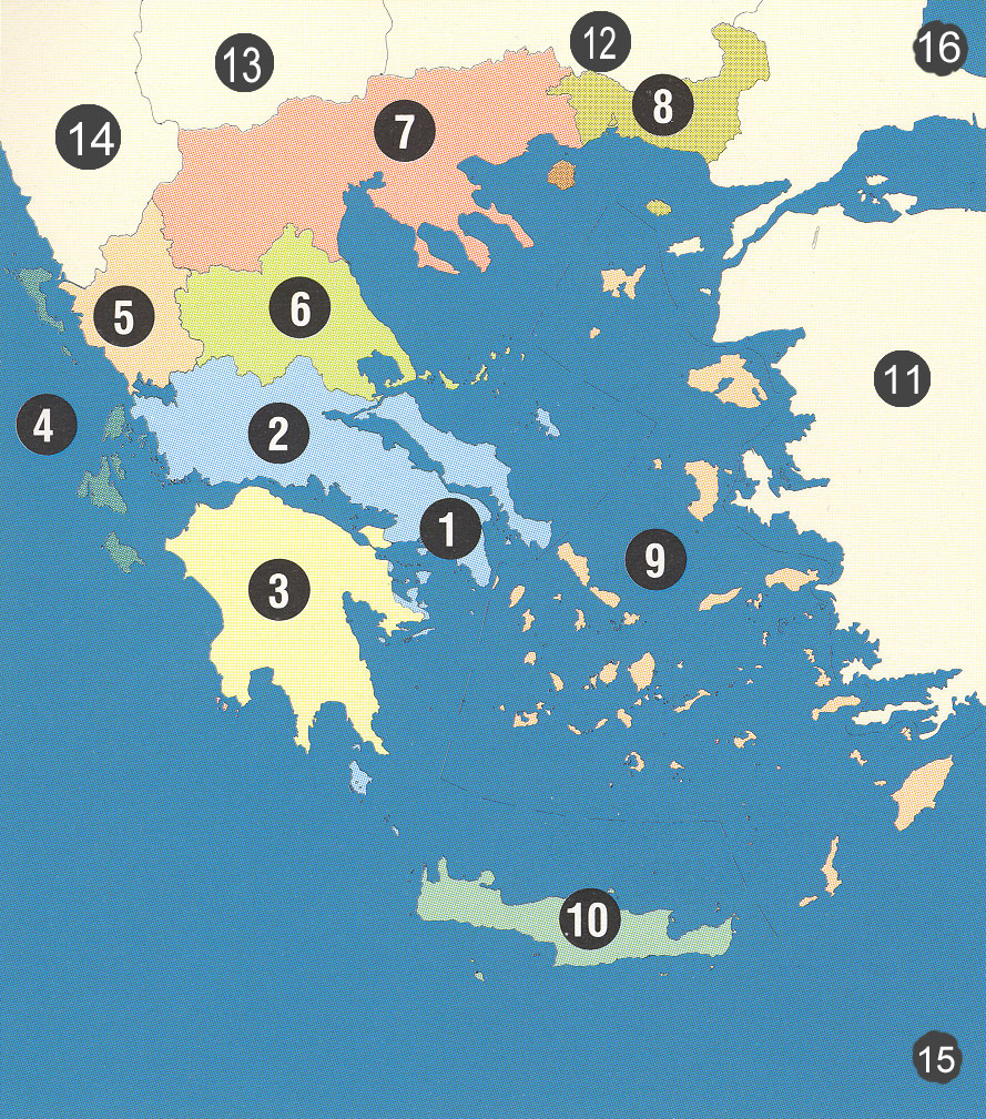 Directions: Either click on one of the numbered circles above on the map or on one of the numbered regions below to go to lists of prefectures, municipalities, and villages in that region. From these lists you may select the appropriate locations under which to post your queries. 1. Athens and Suburbs 2. Sterea Ellada (Central Greece) and Euboia 3. Peloponnese 4. Ionian Islands 5. Epirus 6. Thessaly 7. Macedonia 8. Thrace 9. Aegean Islands 10. Crete 11. Asia Minor* 12. Bulgaria* 13. Serbia* 14. Albania* 15. Middle East & Egypt* 16. Russia* * At various times over the last few centuries (in some cases, millennia) there have been populations of Greek-speakings peoples in these countries, so we assign additional numbers to these areas. |