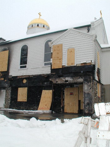 SS. Anargyroi was badly damaged when fire destroyed an adjacent classroom wing on February 18th. Although firefighters protected the main building, a combination of heat, smoke, and water used in firefighting caused irrepairable damage to the interior. The church had just celebrated its 75th anniversary, and the membership was making plans for an addition to be built this spring. Instead, thanks to a faulty heating and cooling unit that sparked the blaze, parishioners face having to rebuild the entire church.