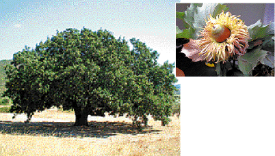![]() Valonia Oak is distinctive by its decorative acorn cups (inset) |