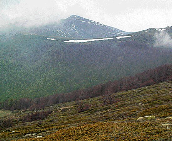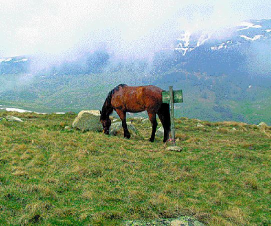But last year, among the other horses that disappeared, were eight of their fifteen, including Haris' beloved mare. He had had her all her life. She was devoted to him, and Haris can't bear to think about what her life is like now - she was old and getting frail. Myrsini, no shrinking violet, as any of her friends will testify - this is the woman who provided much of the grit and courage needed to get the governments of the three countries that share the lakes to sign an agreement making them a gift to the world - says that she no longer dares to go riding up in the hills alone or with her little daughter. In fact, everybody I met thought I was taking insane risks travelling alone in these areas. We started the steady climb up Varnous. After a while we came to deep snow drifts blocking our way, but the higher slopes were free of snow, so I decided that we would have to scale the mountainside and then travel along the ridge. Since the sides were extremely steep and, at that place, stony, I decided to get off, so it would be easier for George. |