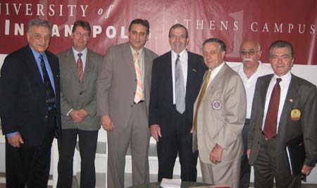 ![]() Ahepans led by Supreme President James (fourth from left) met with University of Indianapolis-Athens Officials Peter Wilkens (second from left) and Vasilis J. Botopoulos (third from left) to re-establish the original Journey to Greece Program. |