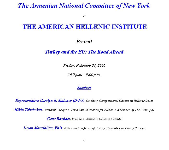 For more information about The Armenian National Commitee click on the title above or click here. For more information about the American Hellenic Institute in Washington, D.C., contact Georgia Economou, Director of Public Relations for AHI, at (202) 785-8430 or at georgia@ahiworld.org, or visit the groups' website at http://www.ahiworld.org. AHI was founded in 1974 following Turkey's illegal invasion and occupation of 37.3% of Cyprus. It is a membership-based organization with members throughout the nation. AHI's core mission is to promote American values and the rule of law in U.S. foreign policy and to strengthen relations between the U.S. and Greece and Cyprus as being in the best interests of the United States. It conducts an active program with Congress in espousing and supporting legislation designed to promote American interests in Southeast Europe and the Eastern Mediterranean and is registered with the Congress under the Lobbying Act. The AHI Foundation is the first think-tank devoted exclusively to the study of the issues confronting the Greek American community. This organization sponsors conferences, seminars and publishes books and other materials on the issues. HCS maintains an extensive archives for AHI articles and press releases which visitors may browse under the American Hellenic Institute Releases section of the archives at http://www.helleniccomserve.com/archiveahi.html. |