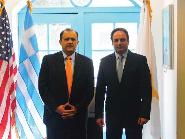 ![]() Cyprus Government Spokesman, Stefanos Stefanou, (right) at AHI Headquarters with Nick Larigakis, AHI president (AHI photo) |