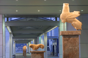 But what really distinguishes this airport from all others, in our opinion, is that Greece has capitalized beautifully on its archaeological heritage by displaying replicas of the artifacts uncovered during excavations of the airport area. These objects date from the Proto-Helladic to the Post-Byzantine period. Passengers can see them displayed magnificently atop beautiful marble columns at the four departures-level entrances of the main terminal building. Silently, yet proudly, they herald the millennia-old, continuous Greek civilization that has given rise to the Western world. |