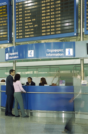 The Athens International Airport SA company has been responsible for all aspects of the project, from design to implementation. It is owned by the Greek State, its major shareholder, and by a private, international business consortium led by Hochtief. As part of its overall business plan, one goal of the company has been to create an airport business community. AIA has realized this goal, housing or creating an infrastructure for more than 200 Greek and international companies and 14,000 employees. About 90 of these companies specialize in providing services for airlines or passengers, according to airport officials. More than 30 smart, modern, Greek and international retail shops fill the inner corridors of the main terminal; a number of restaurants and cafes occupy strategic spots among the retail stores. Travelers will notice with pleasure the smooth check-in procedures at 144 modernized counters and 44 transfer flight desks. Baggage handling has been updated and fully automated, with 11 baggage reclaim belts. Conspicuously rare are the transfer buses that carried passengers to waiting planes. Replacing them are 24 new passenger boarding bridges whose appearance and ease surpass those of comparable US facilities. There are information kiosks staffed by multilingual agents and at-large staff wearing "May I help you" badges to assist passengers. Flight information display boards and screens punctuate the corridors and waiting areas. Spacious departure waiting areas and modernized lounges for first and business class passengers and VIPs add to the ease of passengers. Other conveniences and services await travelers at the fa