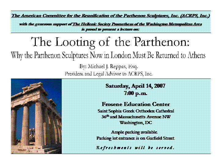 The Board of Directors of the American Committee for the Reunification of the Parthenon Sculptures, Inc. (“ACRPS”), is pleased to announce our first lecture event to be held on April 14, 2007 at the Frosene Education Center at Saint Sophia Greek Orthodox Cathedral in Washington, D.C. This event has been made possible, in large part, due to the support of The Hellenic Society Prometheas of the Washington Metropolitan Area. The main lecture, titled: “The Looting of the Parthenon: Why the Parthenon Sculptures Must be Returned from London to Athens,” will be presented by ACRPS’s President and Legal Advisor, Michael J. Reppas, Esq. |