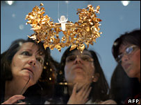 A spectacular golden Macedonian funerary wreath dating back to the 4th Century BC has gone on display at the National Archaeology Museum in Greece. The wreath was returned to Athens at the weekend by the Getty Museum in Los Angeles after a 10-year battle to prove it was illegally excavated and sold. It went back, along with a 6th Century BC marble statue, as the second stage of a deal to return four stolen items. |