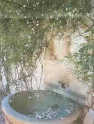 Pots, used as accents, retain a significant role in the Andalusian patio - the geometrical arrangements are carefully arranged to create a succession of seasonal favourites. Plants are brought centre stage and then withdrawn and replaced once their feature of interest has passed - be that bloom, leaf colour or scent. Each plant is shaped and groomed, placed on show and meant to be seen from every angle. In the summer the patios are covered with canvas during the day, and the paving slabs damped down to increase humidity. Foliage becomes predominant at this time large pots of ferns supplemented by wispy Asparagus tenuifolius, clipped balls of box and other evergreens guaranteed to withstand the heat. |