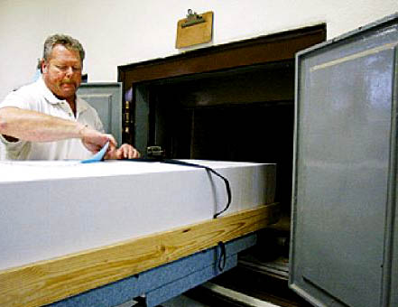 ![]() Crematory worker Joe Bancewicz removes an identification tag from a coffin containing human remains in Mount Auburn Cemetery, Cambridge, Massachusetts |