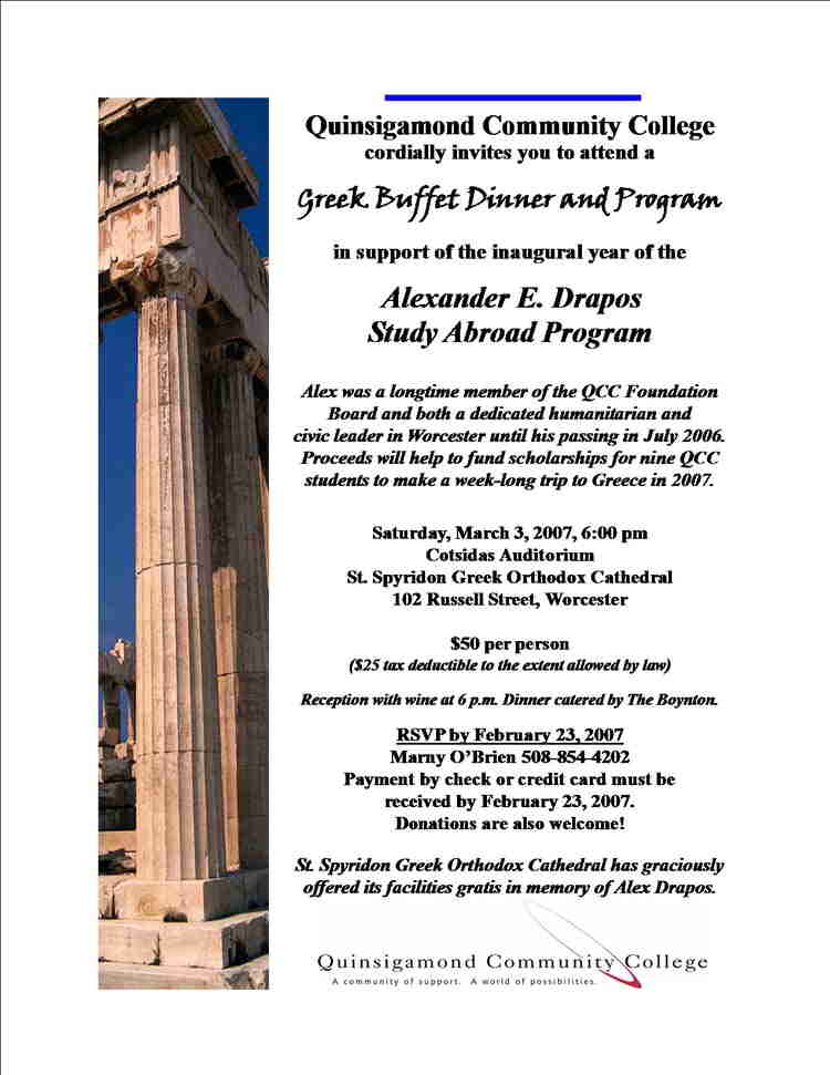 Inaugural Dinner-Program at St. Spyridon Cathedral in Worcester for Alexander E. Drapos Memorial Study Abroad Scholarship Fund at Quinsigamond Community College--Flyer (JPEG