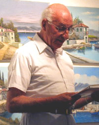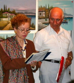 On Friday, June 8, The Greek Institute hosted a very successful event and reception, titled "Artistic Impressions of Mytilene: Art, Literature, and Music." An enthusiastic, capacity crowd viewed the 50-painting exhibition by Panayiotis Malamellis of Lesvos, followed by readings from the works of Myrivilis, Venezis, and Elytis by Helen Nayan, also the Master of Ceremonies, Orestes Demetriades, Mercy Alepidis, Karen Nearhos Kosko and Rhea Karabelas. Professor Nina Gatzoulis of the University of New Hampshire delivered a review of the artist's book, Pikrohamoyelo, or Bitter Laughter.The program and exhibit closed with an address by the artist and a musical improvisation -- a taxim -- by Christos Papoutsy on the santouri.