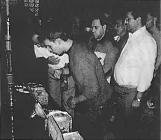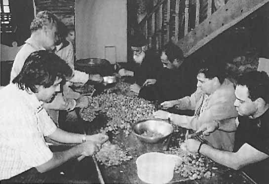 ![]() Greek pilgrims, amny of whom flock to Athos for confession and spiritual uplifting, break almonds at Grigoriou Monastery for the wheat kolyva, eaten after a memorial service |