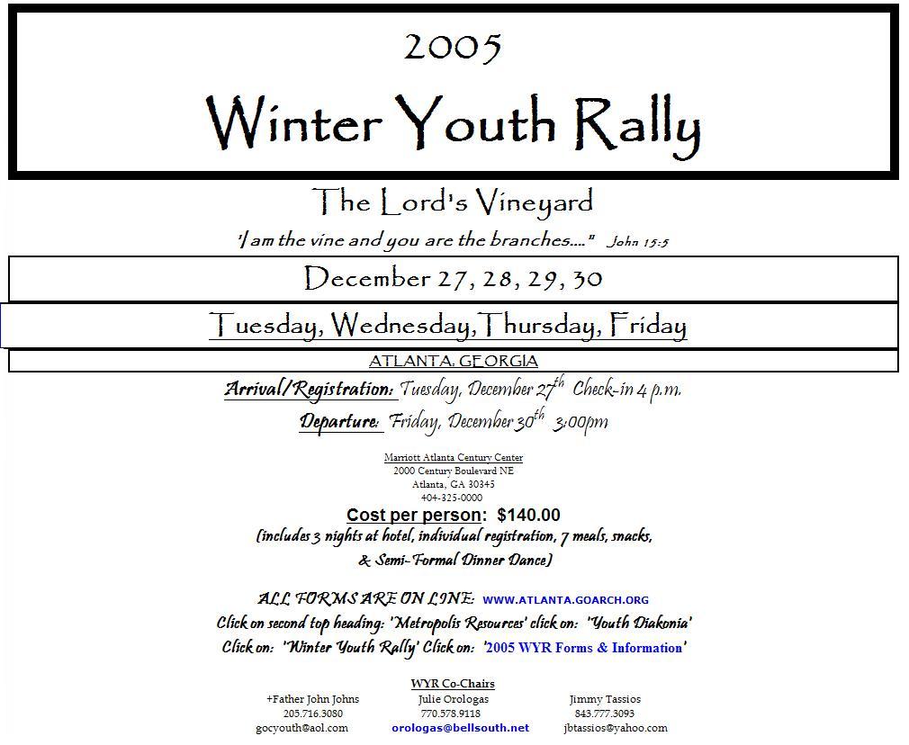 To read an overview letter from the members of the Executive Board of the Winter Youth Rally, click here. The organization has included important instructions and participation restrictions: click here to read these. All forms can be found online at the metropolis website at the URL http://www.atlanta.goarch.org. For a complete list of the members of the Executive Board for the annual Winter Youth Rally, click here. |