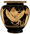 But how did sculptors like Polycleitus produce their masterpieces? What materials did they use, and where did they get them? How were those dazzling monuments of the Classical period financed, and how was the production process coordinated? History records the finished products of human activity, the tangible objects that can survive the passage of time, if not in original material form, then at least as immortalized in reproductions or in the admiring descriptions of legend. But what about the ordinary human labor behind the finished products-- the hard, sweaty, dirty, unglamorous work that goes on behind the scenes, invisible to history? The fifth section of the exhibition-- organized around the theme "The Basis of Classical Culture: Land and Work" -- explores the evidence of this human activity that so easily disappears with the passing of time. Samples of grains and ores from the indigenous habitat, ancient tools, and finds from silver mines illustrate the main sources of industry that underpinned the economy of Classical Greece and financed its ambitious architectural projects: agriculture, mining, shipping, and specialized artisan trades, for example. The working conditions and living routines of ordinary laborers and slaves, so hard to document archaeologically, are brought to life with the help of a detailed model of an ancient ore washing plant, while a model of the workshop of Phidias, the artist of the Parthenon marbles and probably the most important sculptor of Athens, gives us insight into the real, material context in which the great works of the Classical period were created. Particularly interesting additions to the collection are some examples of unfinished works of art and preparatory drawings for vase paintings, which offer an intriguing look into the artistic process.