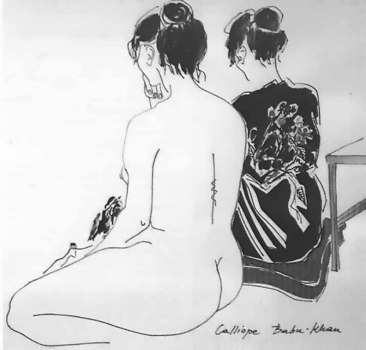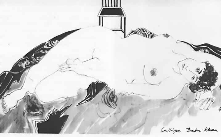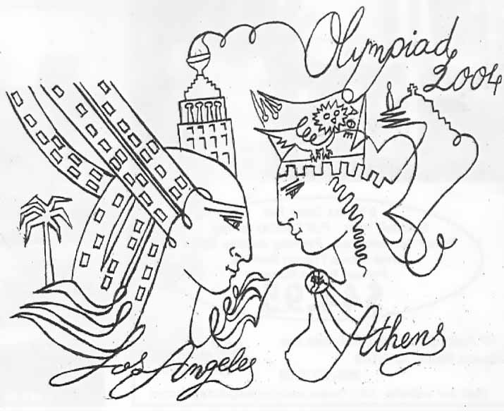 "I don't know how but it just never crossed my mind about making money from art. I can imagine that those artists whose art is selling today in the millions would have ever imagined that it would turn out that way. When we think about it really, how peculiar it is that being an artist we just don't place us ourselves on the same economic strata, yet we also have expenses, we need to eat and live, yet we have separated ourselves from the rest of the world, people who are entangled in those daily routine jobs. Strangely enough I like to give my works to people. I had an exhibit at LMU with paintings on Greek themes. One of the paintings exhibited depicted a scene of the Kastella area outside of Athens. A friend on seeing it quickly remarked that this is the place where she grew up. Well, after the exhibit I told her, 'I'll give it to you.' So, she returned a few days later and I gave it to her even though she offered to buy it, I couldn't accept money from a friend. When you come down to it, it appears that it is a case of placing value, not only on the painting, but placing value as to who will truly appreciate it and deciding as to what is more important at the time. But I have also discovered that unless people pay something for art, they don't always value it." Some of Calliope's most distinctive works are award-winning "biography" paintings that pay homage to individuals who have inspired her. They are exuberant tributes composed of a multitude of images conveying his or her accomplishments. Among her numerous exhibits in the US and abroad, she is especially proud of being part of a formidable exhibit of 150 works representing 83 artists from twelve countries at the Los Angeles Museum of Art simply titled "Women Artists." One of her distinctive multi-layered drawing-paintings won first prize in the juried exhibit called "Women Painters in 1991." In honor of the US Bi-Centennial Anniversary, she mounted an exhibit at Loyola Marymount University paying homage through the depiction of ancient Greek gods from the Olympian pantheon: from Athena, Apollo and Aphrodite to Poseidon. She imposed upon Professor Hugh Gray, a Greek scholar who helped her brother Peter establish the Basil P. Caloyeras Center for Modern Greek Studies at LMU, to obtain university support for her project. Calliope and Peter helped fund the LMU Center for Modern Greek Studies in the name of their beloved father who believed it was important that his children commemorate the culture of their native Greece in America. During the 1984 Olympics in Los Angeles, Babu-Khan commemorated the relationship between Athens and Los Angeles with an enormous 6'x 8' line drawing in black enamel paint depicting the two cities represented by two classic profiles. Los Angeles is shown with freeways as headgear, wings of angels, a palm tree, and the City Hall with the Olympic flame blazing at its top. |