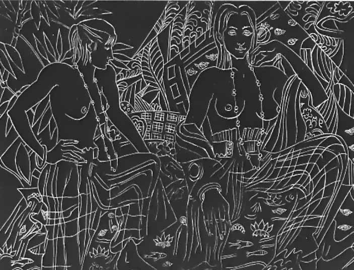 The motive as to why an artist is compelled to inscribe images on canvas or any surface available within reach is often intangible. We look at scenes and compositions of mixed colors called "art" and search for definitive words to describe the artist's intent. Trying to find words to describe such feelings is next to impossible, for it defies the essence of what motivates the artist to share their unique visual experience and individual interpretations. I spoke with Greek-born artist Calliope Caloyera Babu-Khan to learn what motivates her and she said, "My background with Greek, Indian, and other cultures has allowed me to develop my sense of color and line, and has influenced my inner expression. I have explored different techniques using oils, acrylics, drawings, print making, and collage. A series of themes and compositions of still life's and human figures are done using line and color that create positive and negative patterns of intense color and design." |