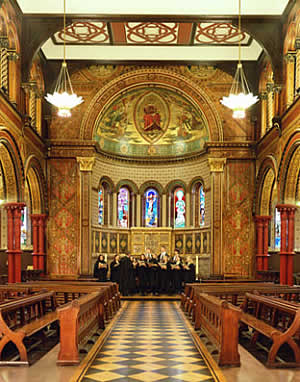 At the 21st International Congress of Byzantine Studies this August, Cappella Romana performed in two concerts given for the 1,100 delegates assembled from throughout the world. The splendid chapel of King's College London, built in the 19th century with Byzantine influences (pictured below right), served as the venue for the London concerts. |