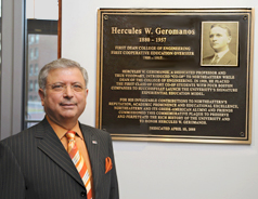 ![]() Northeastern University’s Board of Trustees member George Chryssis stands by a plaque commemorating Hercules W. Geromanos, founder of the university’s co-operative program. |