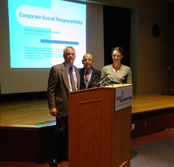 ![]() Assumption College (L to R) Jeffrey G. Hunter, Director MBA Program Christos Papoutsy, Lecturer Adrian Dumas, Director Graduate Enrollment |