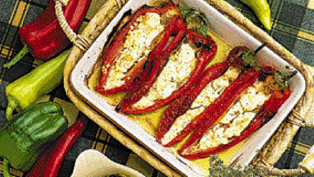 Baked feta (Feta psiti ston fourno) Ingredients Yields 4 servings 1/2 kilo feta, sliced 1cm thick and cut into 10cm squares 1 tsp oregano 1 tomato, sliced 4 tbs olive oil Preparation Feta bread (Tiropsomo me feta) Peppers with feta (Yemistes piperies me feta) Ingredients 8 green horn (or chilli) peppers