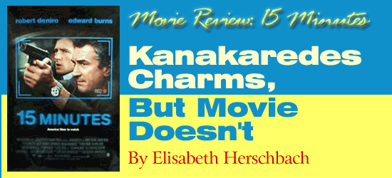 "S'agapo. Se latrevo. Koukla mou." In John Herzfeld's new cop thriller 15 Minutes, it is Robert De Niro-- in the role of homicide detective Eddie Flemming-- who addresses these adoring words to Melina Kanakaredes. But the statuesque Greek American actress, star of the television series Providence, is no doubt already well-accustomed to receiving such glowing expressions of affection-- from her many adoring fans. Born in 1967 to Greek parents living in Akron, Ohio, Melina began her career as a performer by acting, singing, and dancing in community productions and school plays. After high school, Melina first attended Ohio State University, where she became first runner-up at the Miss Ohio Pageant, and then transferred to Point Park College, from where she graduated magna cum laude with a B.F.A. in acting and musical theater. Highlights of her television career include a four-year stint as Eleni Andros Cooper on the daytime soap opera Guiding Light, recurring appearances as reporter Benita Allen on NYPD Blue, the role of the beautiful but vengeful Victoria on a two-hour Due South episode called "Victoria's Secret," and-- of course-- the role of plastic surgeon Sydney Hansen on NBC's popular series Providence. Film credits include The Long Kiss Goodnight, Dangerous Beauty, Bleeding Hearts, and, now, John Herzfeld's newly released, action-packed 15 Minutes. In 15 Minutes, Melina plays Greek American TV reporter Nicolette Karras, girlfriend of superstar cop Eddie Flemming (Robert De Niro). With his gruff charisma and flair for solving sensational cases, Eddie has gained something of the status of a celebrity in media-obsessed New York city. A series of gruesome crimes puts Eddie in partnership with idealistic but hot-tempered arson investigator Jordy (Edward Burns), whose clumsy public image is supposed to contrast with cool and savvy Eddie's knack at working the media to his own advantage. In typical cop-drama style, Jordy and Eddie find that their initial resistance to each other gives way to mutual admiration and affection as their search for the perpetrators of the horrific crimes intensifies. Under pursuit are fiendish Emil (Karel Roden) and his camera-toting pal Oleg (Oleg Taktarov), two stereotypically villainous Eastern Europeans who become swept up in a nightmarish cycle of violence soon after their arrival in New York. Oleg's obsession with making movies finds a grim outlet when he takes to videotaping Emil's brutal acts, and soon the two fugitives-- inspired by what they see as the shallow sensationalism of America's TV and tabloid culture-- hatch a plan to use the tapes to win fame, fortune, and freedom from the law. Gambling that their action will be taken as proof of their insanity and thus will guarantee legal absolution, Emil and Oleg auction off the videotapes to a sleazy talk show host (Kelsey Grammer) who is all too willing to give them their 15 minutes of fame in exchange for a boost in his ratings. Fans of Melina Kanakaredes will find her as lovely as ever, and Hellenes will be tickled by the scene in which De Niro's Eddie fumblingly practices his Greek before proposing to his beautiful Greek American girlfriend. Unfortunately, however, the movie as a whole is quite disappointing. Despite its attempt at social commentary, 15 Minutes is basically just a routine action movie with little nuance and depth but much gore and violence. Dramatic relationships between the characters are never allowed to fully develop, and the characters themselves are flat and one-sided-- mere caricatures, really. Instead of a well-crafted plot that would sustain our interest through its own ingenuity, we get a tortuous barrage of gruesome scenes that seem intended solely to shock us into paying attention. Presumably the movie sees itself as offering a powerful indictment of the ugly excesses of sensationalist TV journalism and the media-obsessed culture it fuels. But although the moral that Herzfeld wants us to draw is pounded out with all the subtlety of a bully pulpit sermon, the movie can't even sustain the soapbox and the message falls flat on its own face. For in the end, 15 Minutes proves itself to be a movie with about a 15 minute attention span-- a movie that is itself too shallow and full of gratuitous sensationalism to be taken seriously. Stay home and watch Providence instead. |