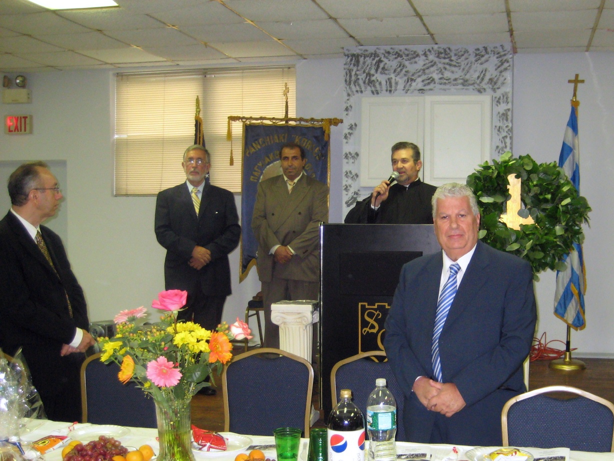 The speaker explained, “This happened. Today Saint Sophia is used as mosque. In turkey, street signs glorify the massacre of the victims of Agio Minas and Nea Moni. How long will Greeks retreat and will the Greek government erase from their history the sacrifice of 58,000 Chiotes? Our memorial today, fellow islanders and friends is dedicated to the memory of those who sacrificed so that future generations will live free. Our venerable fathers brought into the world the two sister virtues of Beauty and Freedom. Long live the 11th of November 1912! Long live our Chios! Long live Greece who god blesses with our beloved second country America.” |