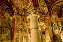Our first experience was visiting the remarkable city of Cappadocia, appropriately considered a Wonder of the World. We had an earlier glimpse of it in Bob Simon’s “Sixty Minutes” which toured the area with Patriarch Bartholomew. (The video is available on the Archdiocese or Archons’ webpage.) Cappadocia in Caesarea is a fairy tale setting fashioned by the volcanic erosions, which formed chimney rocks for over ten thousand years. Within these formations are carved caves that are still decorated with fine Byzantine icons. |