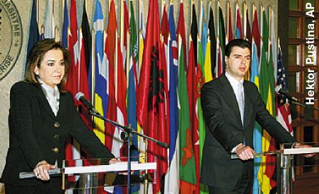 ![]() Greek Foreign Minister Dora Bakoyannis (L) and her Albanian counterpart Lulzim Basha answer reporters' questions during a news conference in Tirana on March 20. Bakoyannis said Athens will not allow the Former Yugoslav Republic of Macedonia to join Nato unless a dispute over the 'Macedonia' name is resolved. She said Greece would support Nato membership bids by Croatia and Albania at an alliance summit next month in Bucharest |