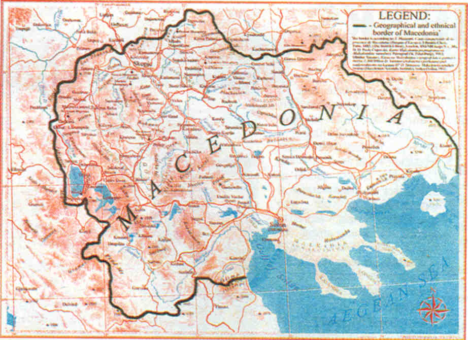 ![]() A typical textbook map of 'Greater Macedonia', with no time designation, showing the country extending deep into Greek territory, to the city of Grevena and Mount Olympus. Greece views such maps as typical of Fyrom propaganda, claiming exclusive territorial, historical and cultural proprietorship over the region of Macedonia |