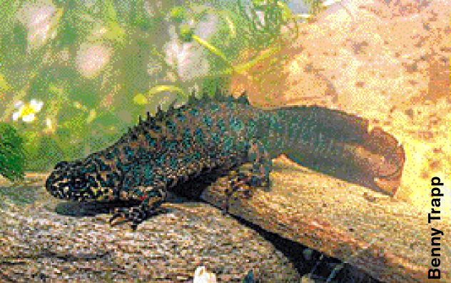 A huge new newt Having failed to make it to Drakolimni, we sought consolation in a wondrous view of blue alpine flowers I found what promised to be the most exciting wildlife of all near the village of Mavranei. While George grazed, I followed a little stream which was teeming with life. I saw a splendid example of the Epiros frog, which is what it says on the label - a frog unique to Epiros. I saw some smooth newts, I saw a dice snake hunting in one of the deeper pools. |