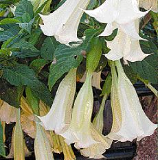 THE EVERGREEN Angel's Trumpets, Brugmansia arborea, has dramatic fragrant white flowers and is native of the Andes of Ecuador, Peru and northern Chile. It makes a great late- summer accent in a pot. Grow in full light in loam-based compost, applying a balanced liquid fertilizer once a month. |