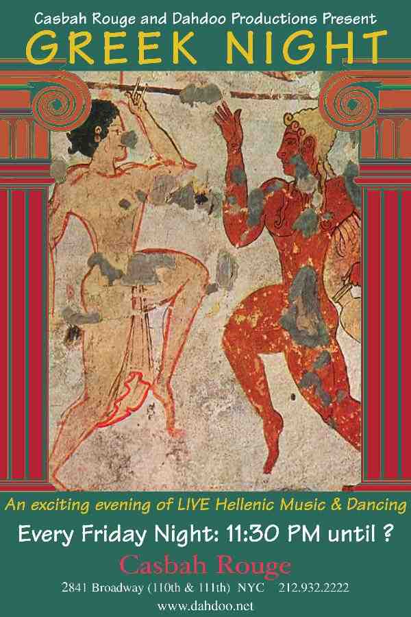 Dahdoo Productions and Casbah Rouge have put together a weekly Friday Greek Night program at 11:30pm featuring live instrumentalists and vocalists. It features many facets of Hellenic music, from rebetiko to traditional folk music and artistic and popular music. Featured performing artists include: Christos Papadopoulous, bouzouki and vocals; Athina Krikeli, vocals and guitar; Richard Khuzami, percussion; Spiros Exaras, guitar and vocals. |