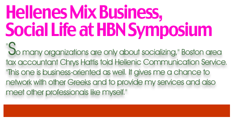A well-known figure throughout the U.S., he has directed, moderated, and hosted radio talk shows, and has appeared regularly on "Sunday Devotions, broadcast by ABC-TV in Houston. The address by Father Triantafilou was the culmination of a lively evening at the Fairmont Copley Plaza Hotel in downtown Boston. "So many organizations are only about socializing," Boston area tax accountant Chrys Hattis told Hellenic Communication Service. "This one is business-oriented as well. It gives me a chance to network with other Greeks and to provide my services and also meet other professionals like myself." Established in 1998, Hellenic Business Network has already conducted seven Business Symposia attracting over 250 Hellenes and Philhellenes from all professional backgrounds. The organization, which seeks to advance the professional interests of Hellenes, has established a Professional Development Series, a Cultural Series, a forum for fostering and promoting business interests, and an interactive website. Further information on HBN membership can be found at www.hbngroup.org. After the event, HBN board member Toula Seremetis declared the event a success. "On behalf of Hellenic Business Network," Seremetis said in a statement to Hellenic Communication Service, "I would like to sincerely thank members and friends for joining us to celebrate our 3rd Anniversary Symposium! Special thanks go out to the Symposium Sponsors and Committee members as this event would not have been possible without their help and continuous support." |