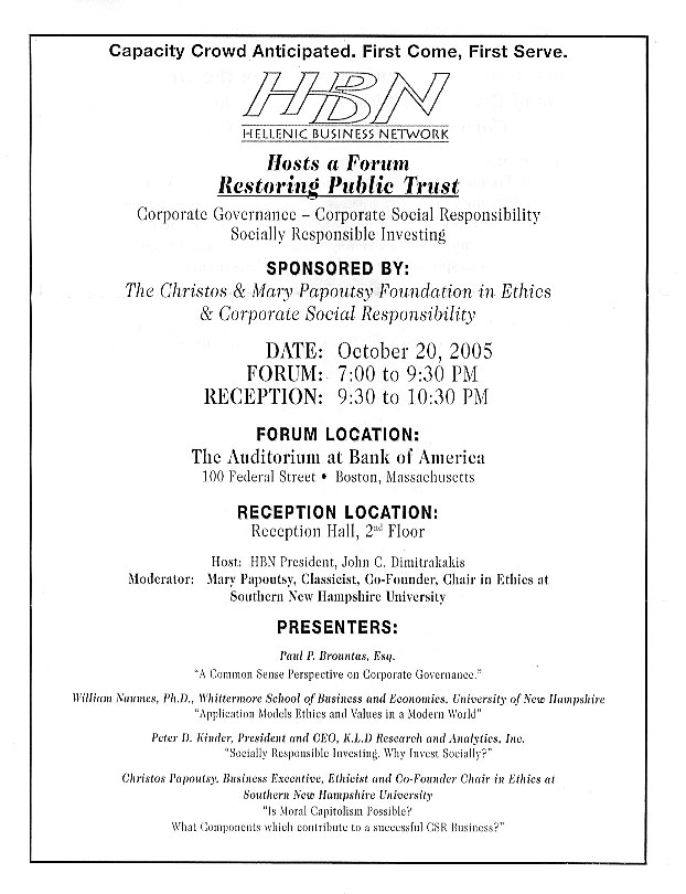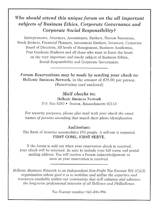 ![]() Hellenic Business Network (HBN) is an independent nonprofit, tax-exempt 501(c)(3) organization whose goal is to mobilize and utilize the expertise and resources available throughout the community that will influence and advance the long-term professional interests of all Hellenes and Philhellenes. Fore more information about Hellenic Business Network, the host of the upcoming ethics forum, visit the organization's website at the URL http://www.hbngroup.org or contact them at 888-251-5568. For more information about the Christos and Mary Papoutsy Charitable Foundations, see the About Us section of Hellenic Communication Service at the URL http://www.helleniccomserve.com/aboutus.html or at the URL for the academic chair in ethics at Southern New Hampshire University (http://www.snhu.edu/papoutsy.html). Readers interested in the topics of ethics, and especially business ethics, may wish to read other articles in the extensive, permanent archives of HCS under the Business Ethics section (http://www.helleniccomserve.com/contents.html#Business Ethics). |