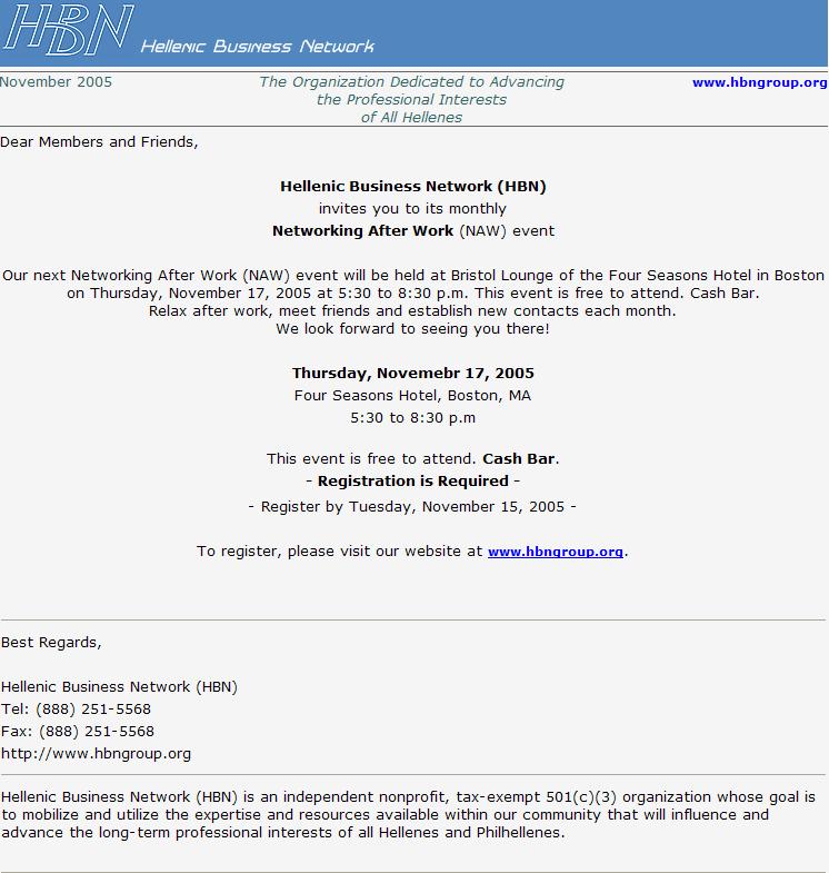 HCS readers may also wish to view other articles and press releases about HBN in our extensive, permanent archives under the Hellenic Business Network section of our site archives or at the URL http://www.helleniccomserve.com/archivehbn.html. Hellenic Business Network (HBN) is an independent nonprofit, tax-exempt 501(c)(3) organization whose goal is to mobilize and utilize the expertise and resources available within our community that will influence and advance the long-term professional interests of all Hellenes and Philhellenes. For more information, contact the organization: Hellenic Business Network, (888) 251-5568 (phone or fax); http://www.hbngroup.org. |