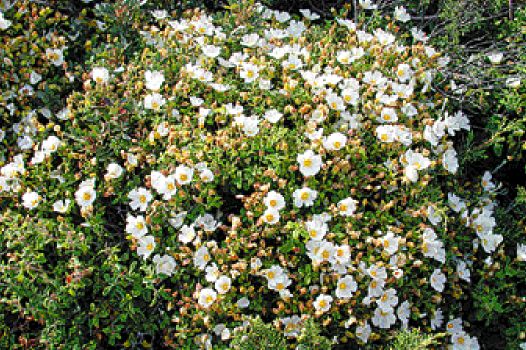 The second type of phrygana is "Cistus phrygana". Common in lowland and coastal areas, it is also often an understorey in open pine woodlands. Cistus are better known as Sun roses, and they are very popular garden plants in northern Europe. They are becoming more widely available here now, but if you want to find some of the unusual ones, try Olivier Filippi's mail order service (Pepiniere Filippi - Plantes Mediterraneennes, Route Nationale 113, Meze 34140, near Montpellier, France. Tel (00 04) 67 43 8869, Fax (00 04) 67 43 84 59. Email: olivier.filippi@wanadoo.fr or see the website www.jardin-sec.com). He has a large nursery in the south of France specialising in native plants but especially Cistus. There are many different kinds of Cistus growing in phrygana, but the two dominant members are Cistus creticus (flowering in pink) and white flowering Sage-leaved Cistus, Cistus salviifolia. Their rather delicate flowers belie their toughness. They are more than capable of taking on coastal winds and salt spray and with only a rocky substrate to anchor themselves in. With the benefit of a garden soil, you will find they grow to twice the size of their usual 50cm; they flower in continuous profusion for a couple of months, their lovely crinkly petals falling each day but replaced by new buds and flowers. They can get a little leggy with age, but you can keep shrubs compact by pinching out stem tips after flowering. |