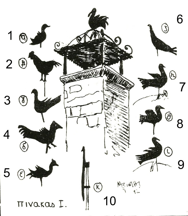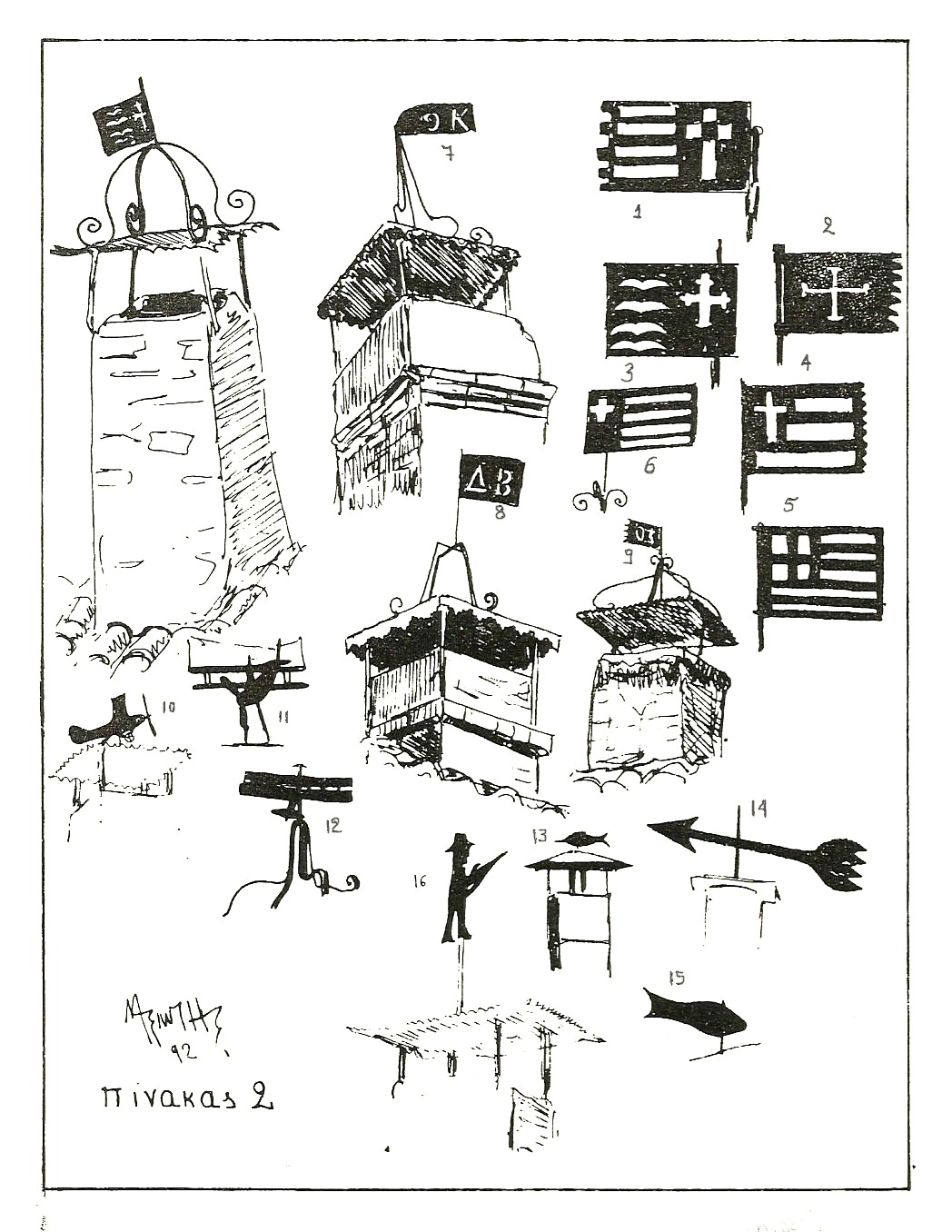 Construction material was kiln-fired brick, but occasionally also stone and lime-mortar were used. The bricks usually were set in rows "upright" (as in Figure 5, diagrams 1, 2, 5, and 12) or "slanting" (as in Figure 6, diagrams 2, 3, and 4). Covering this base material was a veneer of lime-mortar, but in quite a few types the brick was left without veneer as part of the aesthetic scheme of the chimney. On some homes, concavities in the brick bore the initials of the builder and its chiaroscuro gave a special charm to the construction. The removal of one brick near the top of the stack in quite a few chimneys created an opening for better draft. The cap is the top part of the chimney. Here the craftsman focused his artistry, giving it his representative stamp. We discern three basic forms of chimneys in accordance with the construction materials: iron, brick, and stone slabs. Iron The iron chimney is made of square sheets (rarely of round pieces) whose caps are serrated, sometimes plain, other times ornate.* At Agiassos one basic type of chimney is made of unveneered brick and iron whose serration above and below [the plane of the plate] alternates (Figure 6, diagram 1). The iron is supported at the edges of the chimney stack with four iron columns at the corners. At Gera where we have the most beautiful examples of all the villages, there are also weather-vanes. Above the iron cap there are four metal bands from the corners that join together elaborately in the center with coils at their tips. Atop them on a vertical axis is a metal weather-vane in the shape of a bird (Figure 1), a Greek flag (Figure 2, diagrams 1 and 6), a flag with the initials of the owner (Figure 2, diagrams 7, 8, and 9), of a fish (Figure 2, diagram 5), airplane (Figure 2, diagrams 10, 11, and 12) of a hunter (Figure 2, diagram 16), archery bow (Figure 2, diagram 14), and others. In this village chimneys are manufactured with stone and brick, but veneered with lime-mortar. At Plomari some improvised chimneys had for caps a container with openings on the sides (Figure 6, diagram 9). And finally, the elaborate chimney caps of country-mansions should be mentioned, both in the capital [city of Mytilene] and in the villages. These are caps made of iron in various shapes. But they are composite constructions, some created by craftsmen, others made commercially (Figure 6, diagrams 5 and 6). |