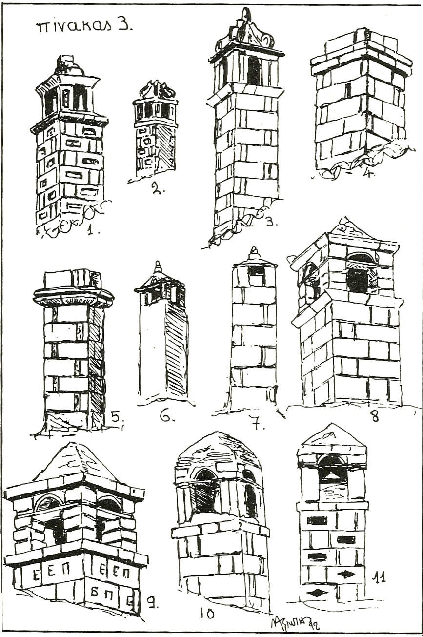 Introduction On behalf of Hellenic Historical and Genealogical Association, I would like to introduce readers to the works of Makis Axiotis. A retired physician with a lifelong interest in history, nature, and archaeology, his works in recent years have become invaluable reference tools for island history. There cannot be a corner of Lesvos that he hasn't visited and observed. His interest in local history is unquenchable, making him a prolific author. Among his many works are a pair of volumes titled Perpantontas te Lesbo: topographia, istoria, archaiologia [Walking about Lesvos: Topography, History, and Archaeology] in which he recounts the island's history and draws archaeological and cultural features seen all over it. Other wonderful recent works, some of which are available on Amazon.com, are his book on watermills of Lesvos, Ydromyloi tis Lesvou [Watermills of Lesvos], and in 2011 his magisterial tome (authored together with his son, Vangelis) Fyta tis Elladas. I erevna sti Lesvo. Votaniki - Chriseis - Toxikotita [Plants of Greece. A Study of Lesvos. Botany - Applications - Toxicity]. His knowledge of Lesvos is encyclopedic and so I hail his periodic articles in local newspapers for new and fascinating gems of Mytilenian history. As I browsed in a bookstore earlier this week, I spotted a copy of his article reprint on the chimneys of the island and snapped it up immediately. While the objects of his keen observation in this piece are unique construction techniques of local artisans, the overall analysis has general application to Neo-Hellenic history and considerable comparative value for other areas of Greece. Perhaps his discussion of these Mytilenian techniques will spur additional studies. What makes Lesvos a particularly good study for Greek history is that it has not experienced the same degree of urban sprawl and commercialization as other places in the country. There are preserved many aspects of local culture and history, in addition to the exquisite unspoiled natural countryside and variety of habitats for flora and fauna. Lesvos even boasts a world-class petrified forest park and numerous thermal springs, testimony to their volcanic origins. Most of it is indeed as ancient writers have described it, quite a rich bucolic setting. In this translation below, I have tried to preserve as much of the writer's style as possible, adding information in brackets only where I felt that a non-local audience might need it. Axiotis originally drew 5 plates of chimneys, each plate averaging about 10 different sketches of chimneys. For our readers I have adapted the plates for Internet use, including renumbering the first plate.Text in parenthesis belongs to Axiotis, while brackets enclose my additions or explanations. The original title of his article was "Symbol in Popular Architecture of the Island. Chimneys of Houses on Lesvos" which I altered slightly for our readers. The pamphlet which I purchased apparently was a reprint from "Epikoinonia Aigaiou A.E."--Mary Papoutsy |