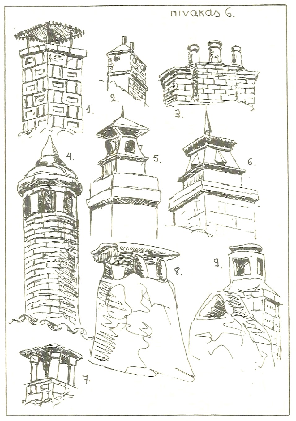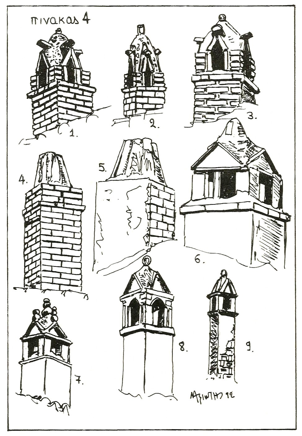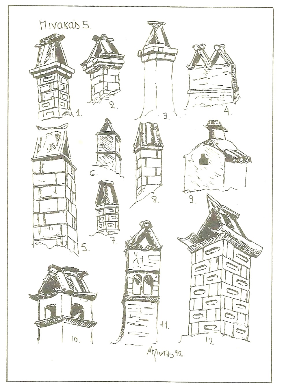 Symbols of Folk-Architecture of the Island Lesvos: Residential Chimneys The use of fire extends back indefinitely into the depths of pre-history. Perhaps even before man created his first tool, he had enjoyed the nature of fire. He used flint and wood to keep it always near him. Evidence of it is found on the floors and ceilings of caves where he lived. The suffering of [mythological] Prometheus is tied to the significance of this human achievement, which was considered a "gift from the gods." The "holy fire" burned lime in the hearths of homes and temples of antiquity in honor of the goddess Hestia. The first hearths found in prehistoric homes were "circular hearths" and were built in the middle of the rooms, patterned after their forerunner. We see similar hearths in Mycenaean palaces, like the one at Pylos (Ano Englianou hill) where its decoration has amazingly been preserved. Four columns around it support the roof, in the middle of which was a square "opening" for the smoke. This is our first chimney. These "holes" in the top of roofs, appear very handsome (round) in sample earthen houses found at various excavations of prehistoric homes (Chaironeia, Myrrini in Karditsa, etc.). The ancient Romans built intricate chimneys because they had a heating system with circulating warm air. Nevertheless the typical precursors of our modern chimneys were developed during the Middle Ages in northern Europe. In the 16th and 17th centuries we have tall, ornately adorned chimneys. Here at Lesvos wood was a plentiful fuel for heating and cooking. The "hearth," an integral part of the house, was often decorated intricately, resulting in this document of study of folk-architecture, because the whole family gathered around the hearth. In country mansions, exclusively as indoor heat (together with braziers), hearths were found in many rooms. That's why the chimney (known by several Greek terms) was an indispensable addition to every roof. The folk- or country-builders of houses in villages, and also the architects of large country-mansions, considered the addition as part of the aesthetic appearance of the house, apart from the technical details of his work. For that reason we see representative symbols of each technician which we can say differ from village to village. Sketches of these works are presented below, the results of extensive hiking through many villages of the island. |