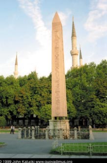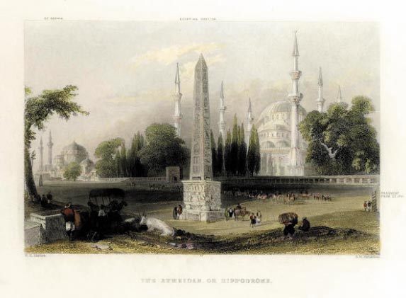 The Atmeidan, or Hippodrome -- in Constantinople ![]() Several years ago while on a holiday in Santa Barbara, California, I visited the Lost Horizon Bookstore on Anacapa Street, one of my favorite haunts. My attention was focused on the shelves that held old books about Greek history, classical Greek literature, and Balkan history. When I took a heavy book from a shelf and placed it on a chest-high cabinet to scan through its pages, steel engraved book illustrations that were lying there caught my eye. The first of these was of the harbor of Smyrna as it appeared in the mid-nineteenth century. It was an image of sea-men and passengers in small, wind-driven boats that rode the crests of breaking waves toward the shore. Putting the book back on the shelf, I turned to stud y the prints, borrowing a magnifying glass from the proprietor of the store so that I could see the details of the engraver's art. Before I left, I purchased six wonderful scenes of the Balkans, Ionia, and Epirus, and became interested in eighteenth and nineteenth century travel books that describe what were then mysterious and romantic regions known to western-Europeans as "Turkey in Europe," and The print, entitled "The Atmeidan, or Hippodrome," 1 is taken from The Beauties of the Bosphorous, a book by Julia Pardoe. Miss Pardoe (1806-1862) deserves a few words. She was born in Beverly, Yorkshire, Great Britain. Early in her literary career, she traveled to Constantinople with her father, a career military officer. While there, she wrote The City of the Sultan and Domestic Matters of the Turks, published in 1838. Her popularity as an author and her knowledge of Turkey led to publication of The Beauties of the Bosphorus, which was issued in three or more editions, the last in about 1855, just after the end of the Crimean War -- between Russia on one side, and Turkey, France, and Great Britain on the other. The artist, William Henry Bartlett (1809-1854), was born in Kentish Town. He was one of the pre-eminent travel illustrators of his day, noted for "faithful representations of scenes as he saw them." 2 The engraver, C. K. Richardson, can not be readily identified. He was one of the countless artists employed by London engravers. Miss Pardoe's and Great Britain's political and religious sympathies (anti-eastern European and pro-Ottoman), are made clear throughout the book, and are succinctly expressed in a florid style, in the final sentences of her introduction. [In the text that follows, the "Autocrat" is the Tsar of Russia, and the "lawful lords of the soil" are the Ottomans.]