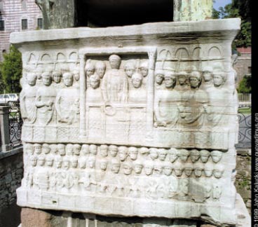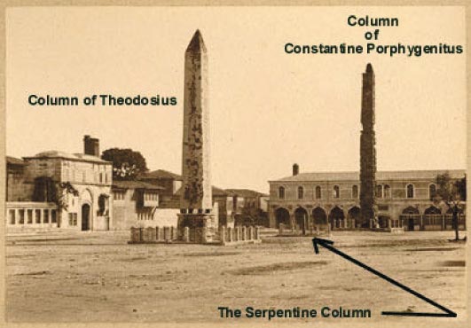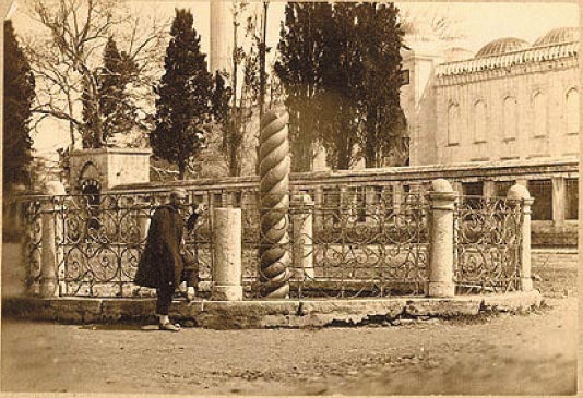 Before the time of Constantine the Great, at the turn of the third century C. E., the legions of Roman Emperor, Septimus Severus, conquered and destroyed the ancient city of Byzantion. In 203 C. E., after he rebuilt the city and expanded its walls, the Emperor constructed the Hippodrome, a sports arena that featured chariot races and other entertainments. One hundred years later, in about 324 C. E., Constantine decided to move the seat of the government from Rome to Byzantio n, which he called The New Rome and renamed Constantinople after himself. Located on the water route between the Mediterranean and the Black Sea, and at the intersection of Asia and Europe, Constantinople was at the center of the changing geopolitical, economic, and religious life of the empire. When Constantine reconstructed and enlarged the city, one of his major undertakings was the renovation of the Hippodrome. Rebuilt, it is estimated to have contained an arena as much as 525 yards long (five football fields!) and 129 yards wide, capable of holding one hundred tho usand spectators. To raise the image of his new capital in the eyes of the Roman world and the barbarian east, Constantine brought works of art from all points of the empire to adorn it. Among these was the tripod of Plataea, an ancient monument that celebrated the victory of the Hellenic, civilized west over -- what they considered to be -- the Oriental, uncivilized east. It served as a reminder to eastern powers that their great armies had been crushed by the west. Constantine ordered the monument to be moved from the Temple of Apollo at Delphi, and set in one of the most visible places in Constantinople -- the middle of the spina of the Hippodrome, the central axis around which chariot races took place. Today, all that remains of this monument is the Serpentine Column. This photograph of the Hippodrome, taken in the mid to late nineteenth century, shows the location of the Serpentine Column in a setting that is very unlike Bartlett's drawing.