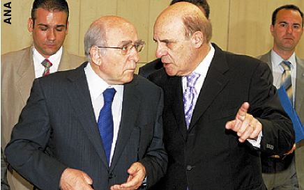 ![]() Environment Minister George Souflias (L) listens to Christos Goulas, head of Ktimatologio AE, during a seminar in Athens on June 11 |
