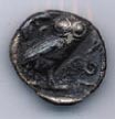I stopped at the table of Wayne Sayles, who had a box full of bronze Roman coins with a little sign on it -- $5 to $25 -- and introduced myself. He was not busy, so took the time to show me some Roman coins and answer questions. We came upon a coin of the Emperor Justinian, who I thought of as Byzantine, not Roman. Sayles reminded me that the Byzantine Empire was the successor to the eastern Roman Empire. At home I re-read Norwich's Byzantium -- The Early Years, which confirmed that Justinian was the last of the emperors considered to be Roman rather than Byzantine, one whose "mind was cast in a Latin mould, and that throughout his reign...devoted the greater part of his prodigious energies to the restoration of the old Roman Empire." 3 Only $15 for the Justinian! I purchased it, and another of Constantius I, the father of Constantine the Great, for another $15. Now, they were not great coins. The Justinian was off center, with barely visible lettering. Constantius I was in better shape, and the lettering on its obverse was legible -- not that I understood the words the letters formed. I left Mr. Sayles as a collector, with two coins and a lot of advice about buying books before I purchased coins. I followed Sayles guidance. The book I purchased next was his Ancient Coin Collecting. 4 And I subscribed to The Celator, a periodical devoted to ancient coins. Slowly, I built a small library, and made coin purchases from mail catalogue auctions and at bourses, but my collection lacked the coin I most wanted, an Athenian tetradrachm. The problem was to find one that I both liked and could afford. The reasons one may want a particular coin for a collection are varied. In this case, the best I can do is to state the obvious: the history of ancient Greece fascinated me; Athens was the center of the classical Greek world; Athena, the helmeted war-goddess, was its patron; and she appeared on the coins of Athens for more than one hundred years. Huge sums must have been necessary for the commercial activities of Athens' port city, Piraeus, construction atop the Acropolis and in the city, financing of the Athenian fleet, and perennial warfare. The money was derived not only from annual tribute received from the Delian League city-states, but from rich silver deposits Athens owned and mined at Laurium, close to Cape Sunium as well. The mines provided the silver that paid for construction of the fleet that destroyed the Persians at Salamis in 479 B. C. E. Common to all issues of the coin are the goddess Athena, in profile on the obverse, and the owl, her constant companion, standing on the reverse, a sprig of olive leaves with a berry above its shoulder. Variations in design exist among denominations of the coin (there were up to nine such, the smallest, a tetartemorion, equal to 1/ 24 th of a drachm, weighed 0.22gms -- 0.0056oz.). There are many deviations in the countenance and costume of Athena on the obverse of coins of this type. There are equally many differences in the representation of the Owl of Athens on the reverse where the owl, olive leaves, berry, and crescent moon are symbols whose style of execution are idiosyncratic to a particular issue. After 480-470 B. C. E., an olive diadem was added to Athenas' helmet, and a crescent moon appeared over the owl's shoulder. The crescent moon has been interpreted as representing the waning moon, the phase that occurred at the time of Athenian victories over the Persians at Marathon and Salamis. It may be, however, that it was added only as a reference to the nocturnal habits of the owl. Athenian coins were universally known as "Owls". The owl was sacred to Athena and as she was the personification of wisdom, it was symbolic of that attribute. In the Iliad, Homer sometimes used "Owl Eyed Athena, " as an epithet for Athena. Scholars have also noted that the Acropolis was the home of small owls whose faculty of excellent night vision would be useful to the Athena in her role as a warrior and the city's protector. The olive tree was sacred to Athena for she created it in a contest with Poseidon for the possession of Attica. The presence of the olive leaves on her helmet, and leaves and berries on the reverse of the coin refer to her symbolically.