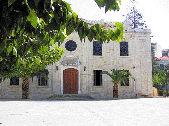 on the left side of the square - a nice place to stop for a rest, particularly if you are there on a Sunday morning when you can listen to the bells ringing and watch the families streaming out of church after the service. One of the cafes in the square is the very trendy Pagopoleion (the old Iraklio ice factory), which was taken over by the Germans during World War II, and a German inscription on the wall in the back room is still there (unfortunately, nobody could translate it for us). |