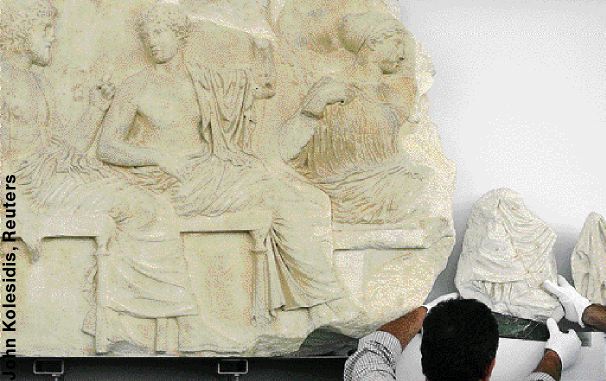 ![]() Archaeological restorers place a marble section of the 2,500-year-old Parthenon frieze beside a matching fragment at the New Acropolis Museum in Athens. The artefact, mounted on a green marble base, was returned as a permanent loan from a museum in Sicily, Italy, on the occasion of Italian President Giorgio Napolitano's state visit to Greece |