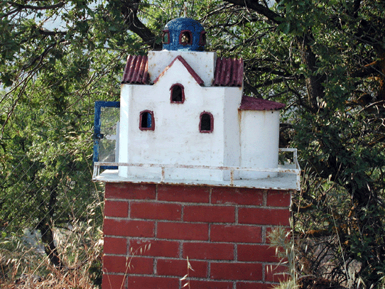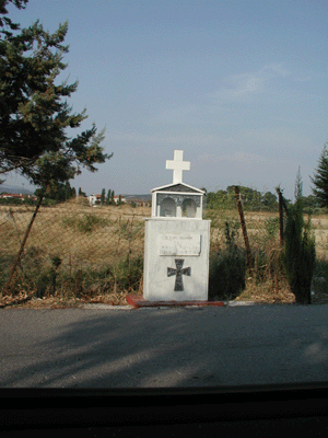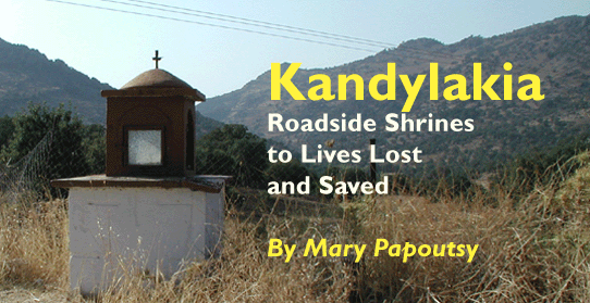 Although kandylakia often appear alike, some are quite unique and differ markedly from the customary simple lines to represent houses, Byzantine churches, and even grave stele. Materials also vary, depending on the choice of the family commissioning this shrine: metal, wood, marble, and even ceramic materials can be found. Each must be commissioned individually from local trades people--woodworkers, metalworkers, and stonecutters--but the family and tradesperson determine the overall shape and complexity jointly. Custom dictates that at least one icon and a votive candle be placed within the box, but some families include small bottles of Holy Oil and request that the date and name of the individual lost or saved be inscribed on the kandylaki. For the Greeks, then, these roadside shrines represent momentous occasions, some of them tragic, but others quite miraculous. Strong ties to family and cultural heritage guide the tradition of erecting dedicatory kandylakia. Lasting memorials to lost relatives are an essential part of Greek culture, drawing upon ecclesiastical tradition of annual memorial prayers, invocations of patron saints, and the lighting of candles. The kandylaki is reminiscent of a tiny church in some of its functions, serving as a repository for icons, Holy Oil, and candles. Family members recite prayers there periodically and tend the shrine as lovingly as they would a gravesite. For the kandylaki represents the world of the Greeks in miniature: their religious outlook, their attitudes toward relatives and ancestors, their understanding of the unpredictability of Fate, and their knowledge of the danger and occasional inhospitality of their surroundings. For the Greeks, remembrance is a cornerstone of society, remembrance of family, history, religion and culture. But above all, the kandylaki reminds every Greek traveler of the need to appreciate life, for just as it marks a life lost, so, too, does it mark a life saved. ![]() (Posted August 2005) Click here to view a picture album of kandylakia in northern Lesvos, one of the largest Greek islands in the Aegean. |