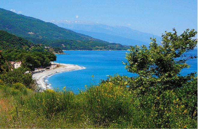 By tourists, that is. Fruit-growers already know that it's a Garden of Eden. The gentle slopes around Agia, its only town, must have more orchards than anywhere else in Greece. In May-June they give us cherries, followed by peaches, pears and kiwis. Almonds, hazelnuts, olives and chestnuts also grow in profusion, but dwarfing them all is the apple crop: 50,000 tonnes of apples roll off Agia's trees into our markets every year. This means that Agia and the villages around it have not had to look to outsiders for their living. |