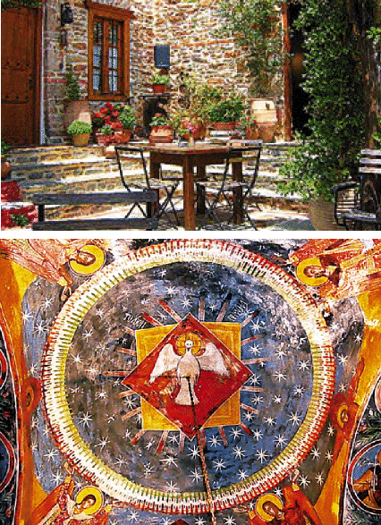 ![]() The flowering terrace at Arhontiko Soulioti (On top) A fresco at the Prophitis Ilias church above Metaxohori (On the bottom) |