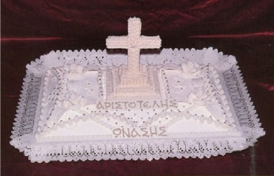 On another shopping foray into the heart of the city, I discovered another shop with reasonable prices for kollyva decorations and related memorial service supplies on busy Athinas Avenue not far from the Monastiraki subway station. It was fascinating to see the range of flowers, letters, crosses and other items for purchase. This store also carried small paper bags with crosses on the front for dispensing the wheat mixture. Here I also bought several more crosses, Byzantine style, made in the same fashion as the Greek initials, with a thin layer of frosting onto which dragees were arranged artfully, and about a dozen small pastry florets with round dragee centers. The wait staff was helpful and kind, offering directions on preserving the materials until their use.