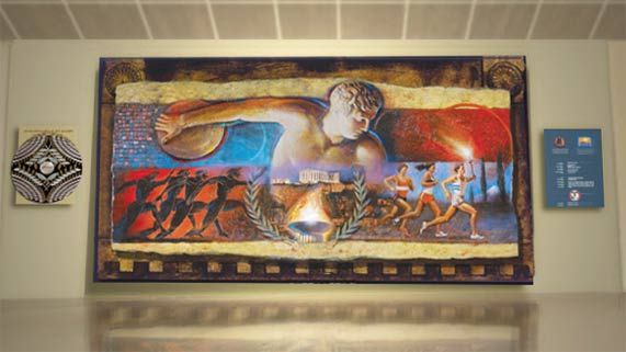 KYKLOS is a “Michelangelo like” panoramic fresco, epic in size and meaning. It is a symbolic gift representing the Hellenic ethos of a world community united in spirit to celebrate their heritage on the occasion of the 2004 homecoming of the 28th Olympiad. Next to the mural, an engraved circular sculpture honors the many international donors on bronze, silver and gold olive leaves.